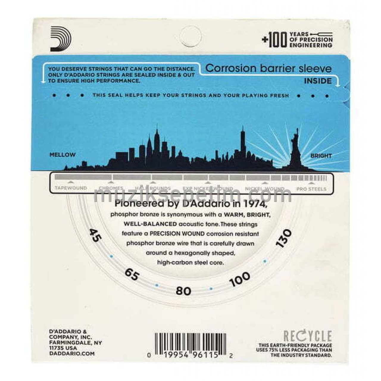 Phosphor Bronze was introduced to string making by D`Addario in 1974 and has become synonymous with warm, bright, and well balanced acoustic tone. D`Addario Phosphor Bronze strings are precision wound with corrosion resistant phosphor bronze onto a carefully drawn, hexagonally shaped, high carbon steel core. The result is long lasting, bright sounding tone with excellent intonation.