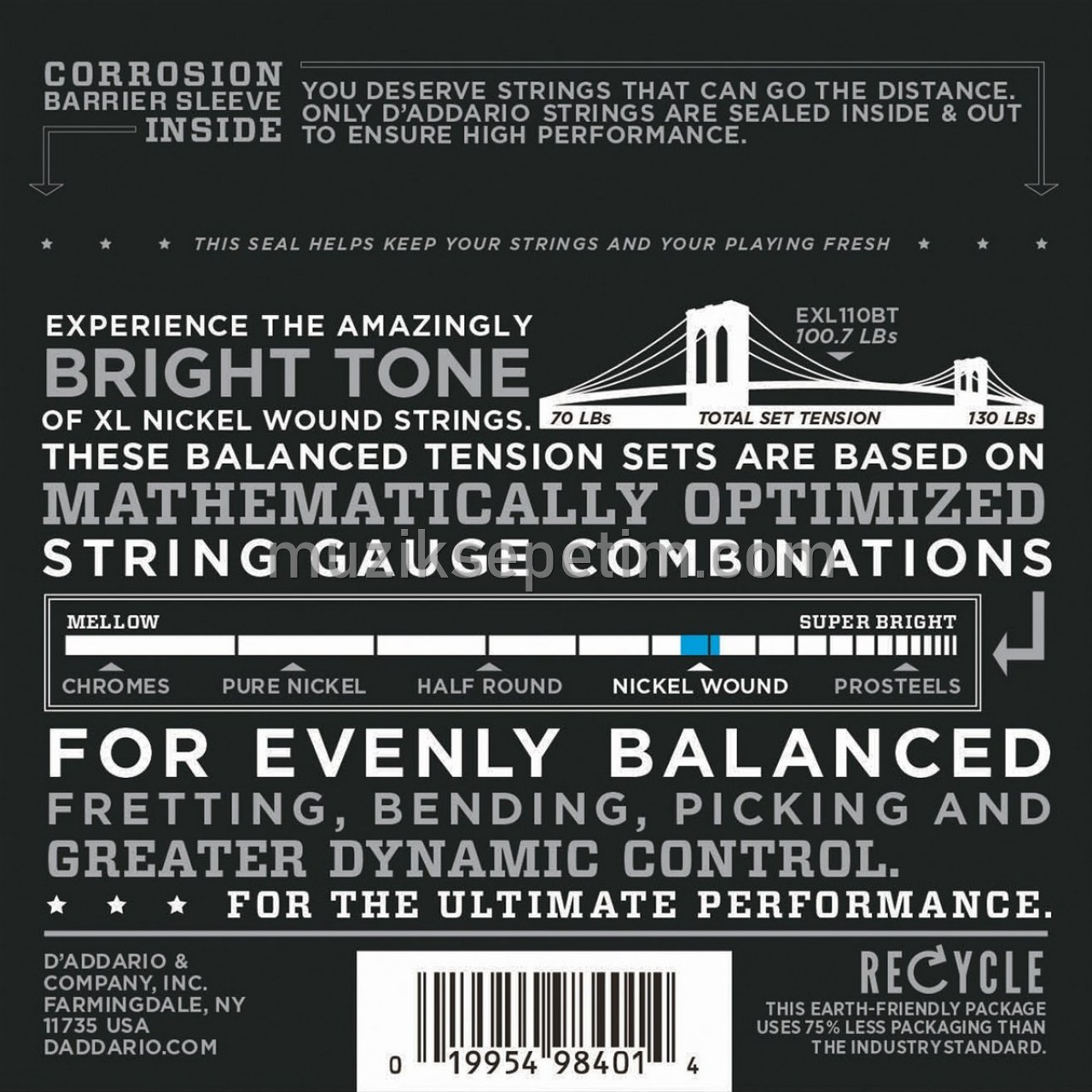 D`Addario EXL110BT Balanced Tension electric guitar sets are comprised of mathematically optimized string gauge combinations, resulting in greater control and playing comfort. Combined with the distinctive bright tone of XL nickel wound strings, each set offers greater dynamic control and a more consistent feel between strings for evenly balanced bending, strumming, fretting, picking, and plucking.