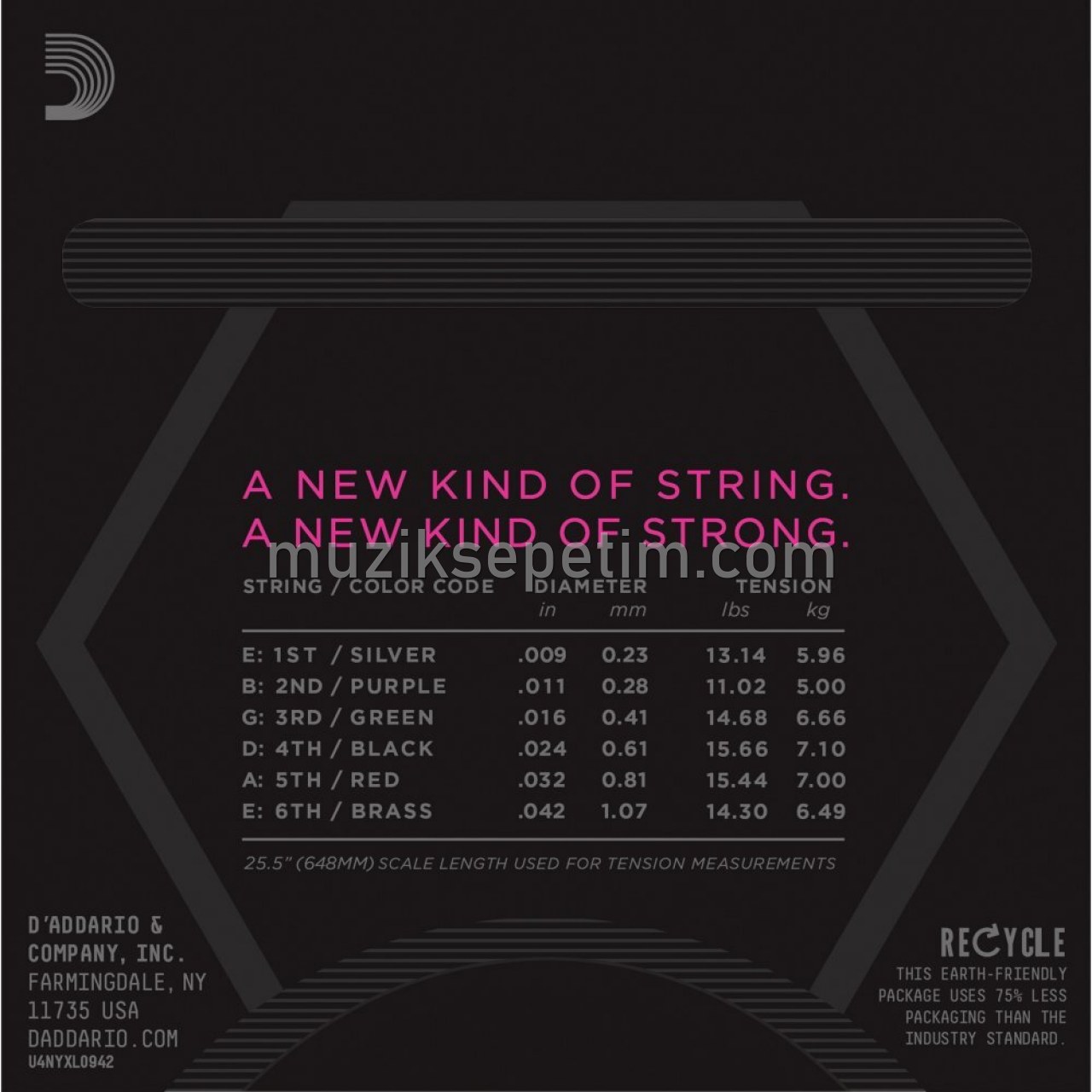 D’Addario NYXL gitar telleri daha yumuşak bükümlüdür, daha yüksek ses çıkarır, ve akardunu bugüne kadar kullanmış olduğunuz bütün tellerden daha uzun süre muhafaza eder. Tasarlanılması, mükemmelleştirilmesi ve üretimi D’Addario tarafından New York tesislerinde gerçekleştirilmiştir. Bu yeni bir mühendislik ürünü, kırılmaya karşı dirençli, yüksek karbonlu çelik çekirdek (iç tel) ve çelik alaşımı tamamen yeni bir özgürlük seviyesi, güven ve güç sunuyor. NYXL ler daha dayanıklı olup 1`e varan akord kararlılığı sunmaktadır. Bunu sağlamak için düz çelik tellerin çekiminde tamamen devrimsel bir yenilik olan, yeni nesil “fusion twist” tekniğini kullanmaktadır. Yeniden formüle edilmiş nikel kaplama tel sarımları yüksek çıkışlarda ve orta kademe frekans bölgelerinde haşırtı ve çatırtı sorunlarının giderilmesinde daha iyi manyetik özellikler sergilemektedir.