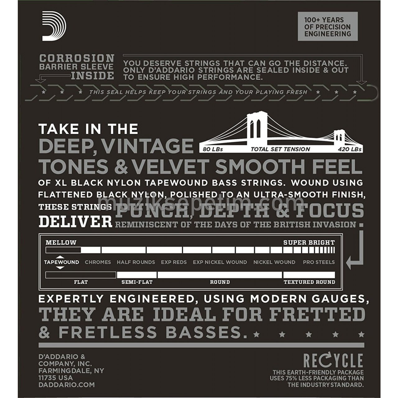Designed to produce a deep, warm tone with smooth feel, D’Addario Tapewound Bass strings are wound using a flattened black nylon which is polished to an ultra-smooth finish. These long-lasting, well-balanced strings are expertly engineered to provide optimal tension and are gauged to fit properly on standard bass saddles and nuts. Tapewounds may be used on fretted or fretless basses and are designed to deliver a vintage tone ranging from the thump of an upright bass to the focused depth of traditional flatwound strings.