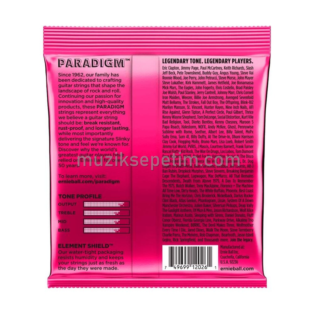 Ernie Ball Slinky Paradigm Elektro gitar telleri, yüzde yüz Slinky tonunu ve hissini korurken benzeri görülmemiş güç ve daha uzun ömür sağlar. Ernie Ball'un endüstri lideri ultra yüksek mukavemetli çeliği,hızlı akortlanır.Üstün gerilme ve yorulma mukavemeti sağlamak için her düz telin bilye ucunda patentli bir takviye ile sarılmasıyla da akord kaçırımını en zorlu çalım koşullarında bile engeller.Ernie Ball'un Everlast nano iyileştirilmiş teknolojisiyle, güçlendirilmiş plazma sarımlı telin birleştirilmesi, ilave korozyon direnci verir ve ton kaybının azalmasını sağlar. Tüm bu avantajlarıyla sizlere uzun ömürlü keyifli bir çalım deneyimi amaçlar.